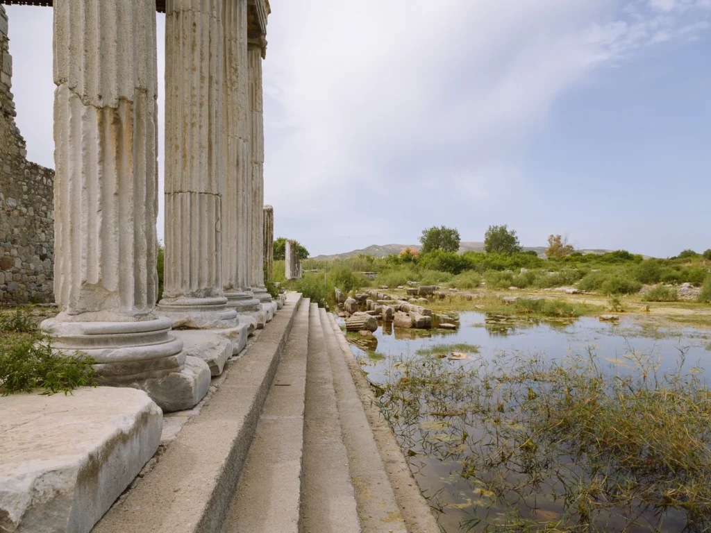 Stroll the grid system of streets (which became a template for future Roman cities); explore the Greco-Roman theatre that is still in excellent condition; and watch the Ionic Stoa of the Sacred Way reflected in the (often) flooded plains.