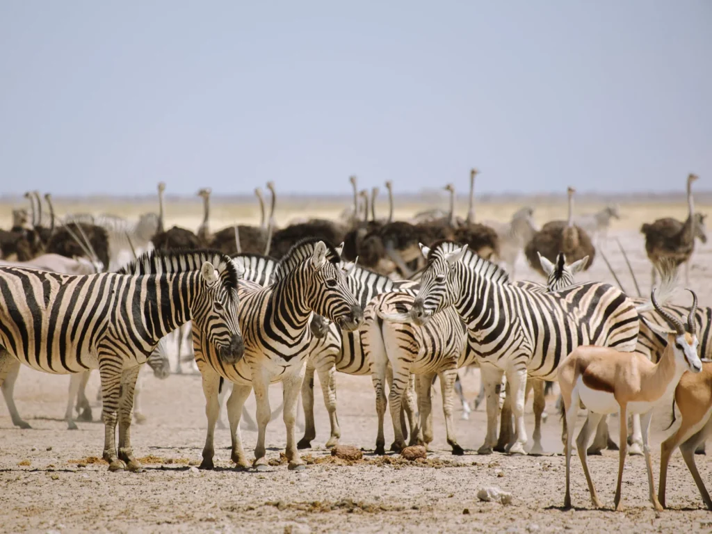 Vast herds of zebra, springbok, impala and oryx are joined by ostriches, giraffes and elephants trying to cool down and get some much-needed water.